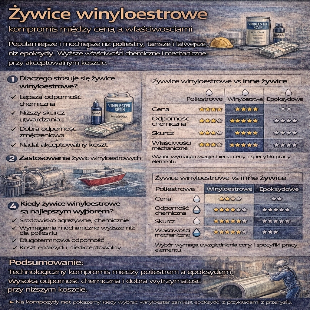 Żywice winyloestrowe zajmują pozycję pośrednią między żywicami poliestrowymi a epoksydowymi. Łączą lepsze właściwości mechaniczne i chemiczne niż poliestry z niższym kosztem i łatwiejszym przetwarzaniem niż epoksydy. Dzięki temu są często wybierane tam, gdzie wymagania są wyższe, ale budżet i technologia nie uzasadniają użycia epoksydu. Czym są żywice winyloestrowe? Żywice winyloestrowe to żywice epoksydowe modyfikowane grupami winylowymi, co pozwala im: W praktyce […]