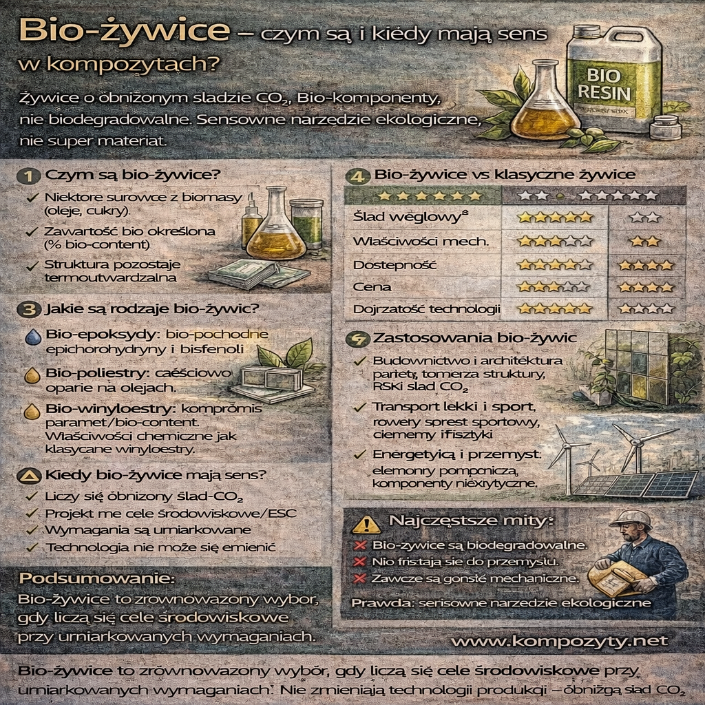 Bio-żywice to grupa żywic polimerowych projektowanych z myślą o obniżeniu śladu środowiskowego kompozytów, przy jednoczesnym zachowaniu parametrów użytkowych wymaganych w przemyśle. Choć często mylone z „w pełni biodegradowalnymi”, w praktyce są to żywice częściowo lub w całości oparte na surowcach odnawialnych. Czym są bio-żywice? Bio-żywice to żywice, w których: ➡️ Bio-żywica ≠ biodegradowalna żywica (to bardzo częsty błąd). Dlaczego […]