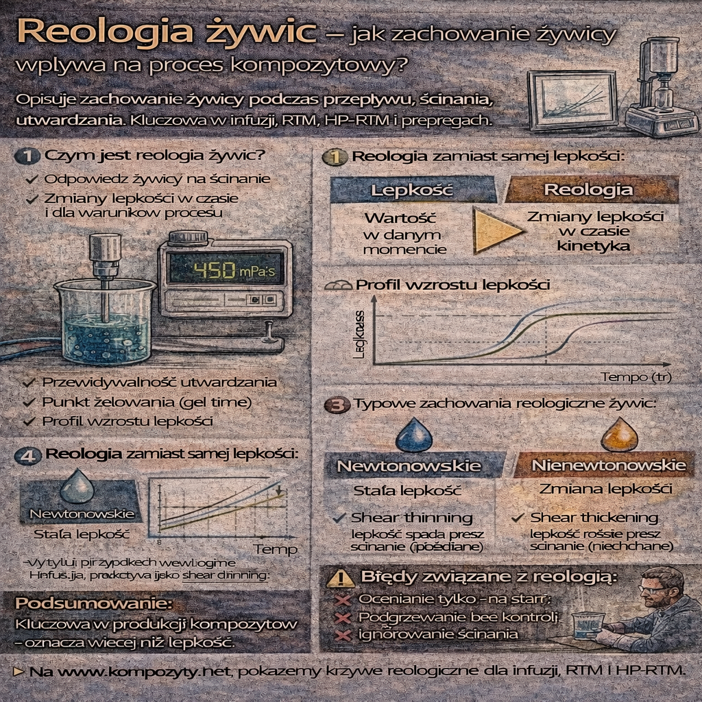 Reologia żywic opisuje, jak żywica zachowuje się podczas przepływu, ścinania i utwardzania. To właśnie reologia – a nie tylko lepkość „na kartce technicznej” – decyduje o tym, czy proces będzie stabilny, powtarzalny i wolny od defektów. W praktyce reologia jest jednym z kluczowych parametrów w infuzji, RTM, HP-RTM, SMC/BMC i prepregach. Czym jest reologia żywic? Reologia bada zależność między: […]
