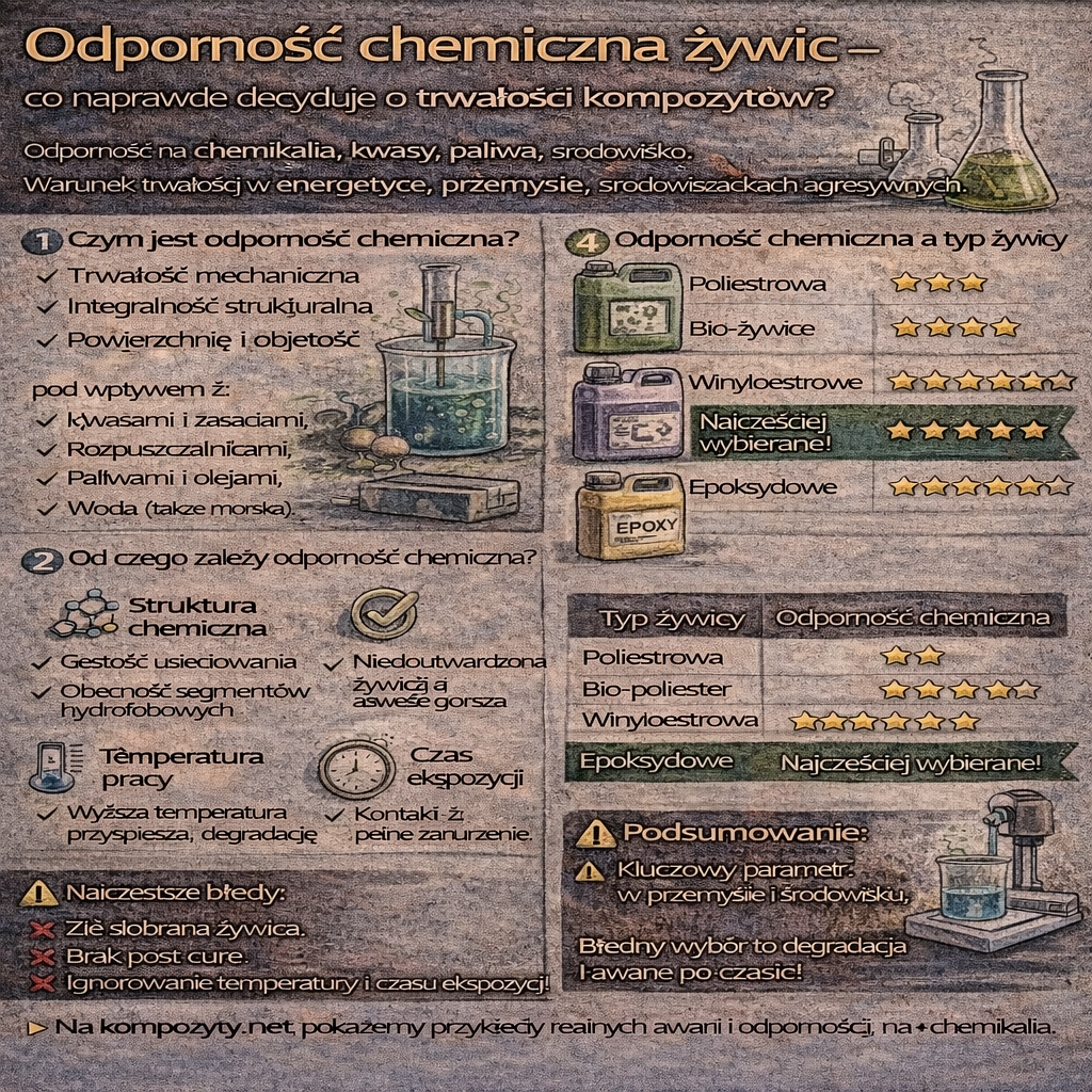 Odporność chemiczna żywic to jeden z kluczowych parametrów decydujących o długoterminowej trwałości elementów kompozytowych, szczególnie w przemyśle, energetyce, budownictwie i środowiskach agresywnych. W praktyce to właśnie żywica – a nie włókno – jest pierwszą linią obrony przed chemikaliami. Czym jest odporność chemiczna żywic? Odporność chemiczna oznacza zdolność żywicy do: pod wpływem kontaktu z: ➡️ Brak odporności chemicznej prowadzi do powolnej, […]