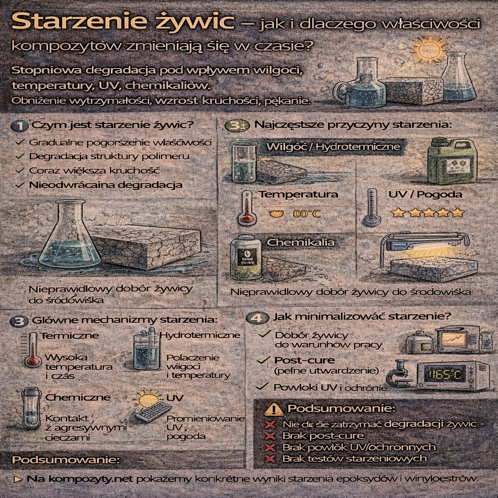 Starzenie żywic epoksydowych to proces stopniowej degradacji właściwości materiału, zachodzący pod wpływem czasu, temperatury, środowiska chemicznego, wilgoci i promieniowania UV. Nawet najlepiej zaprojektowany kompozyt może tracić swoje parametry, jeśli warunki eksploatacji nie zostały prawidłowo uwzględnione na etapie doboru żywicy i technologii. Czym jest starzenie żywic? Starzenie to zbiór zjawisk fizycznych i chemicznych, które prowadzą do: Proces ten jest nieodwracalny i […]