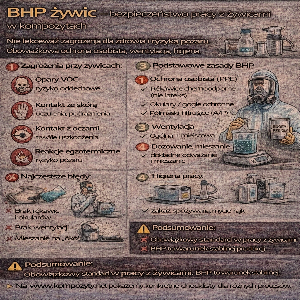Bezpieczeństwo pracy z żywicami to jeden z najczęściej bagatelizowanych, a jednocześnie najbardziej krytycznych aspektów produkcji kompozytów. Żywice, utwardzacze i dodatki chemiczne niosą realne zagrożenia dla zdrowia – zarówno krótkoterminowe, jak i długofalowe. Prawidłowe BHP nie jest „papierologią”, lecz elementem stabilnego i odpowiedzialnego procesu technologicznego. Dlaczego BHP przy pracy z żywicami jest tak ważne? Kontakt z żywicami może prowadzić do: ➡️ […]