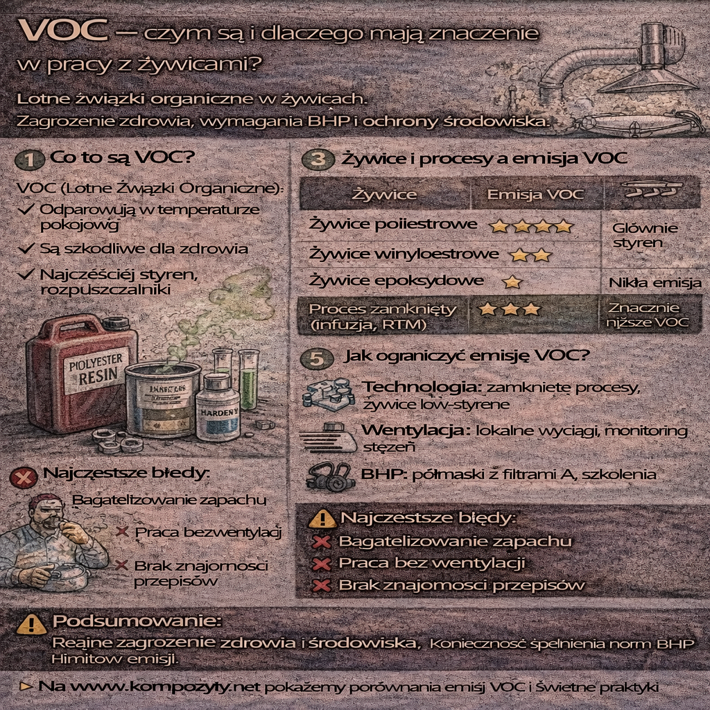 VOC żywice to temat kluczowy zarówno z punktu widzenia BHP, jak i ochrony środowiska oraz zgodności z przepisami. Lotne związki organiczne (VOC – Volatile Organic Compounds) są naturalnym „produktem ubocznym” wielu systemów żywicznych stosowanych w kompozytach. Ich obecność wpływa na zdrowie pracowników, komfort pracy oraz możliwości technologiczne zakładu. Czym są VOC? VOC (Lotne Związki Organiczne) to substancje chemiczne, które: W […]