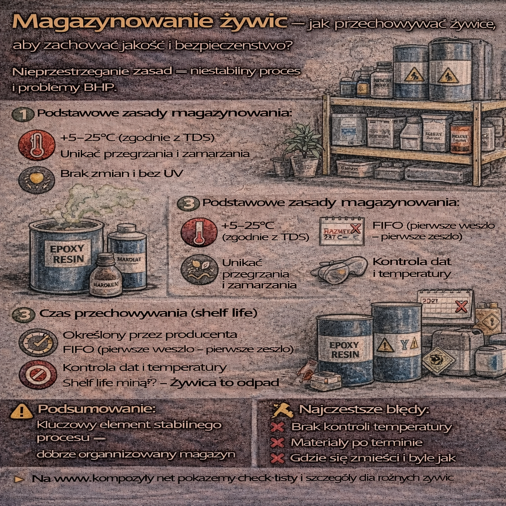 Magazynowanie żywic to jeden z najczęściej niedocenianych elementów procesu kompozytowego. Tymczasem nawet najlepsza żywica traci swoje właściwości, jeśli jest przechowywana w niewłaściwych warunkach. Błędy magazynowe prowadzą do niestabilnego procesu, defektów laminatu, skrócenia trwałości materiału i problemów BHP. Dlaczego prawidłowe magazynowanie żywic jest tak ważne? Nieprawidłowe przechowywanie może skutkować: ➡️ Problemy „na produkcji” bardzo często zaczynają się w magazynie. Podstawowe […]