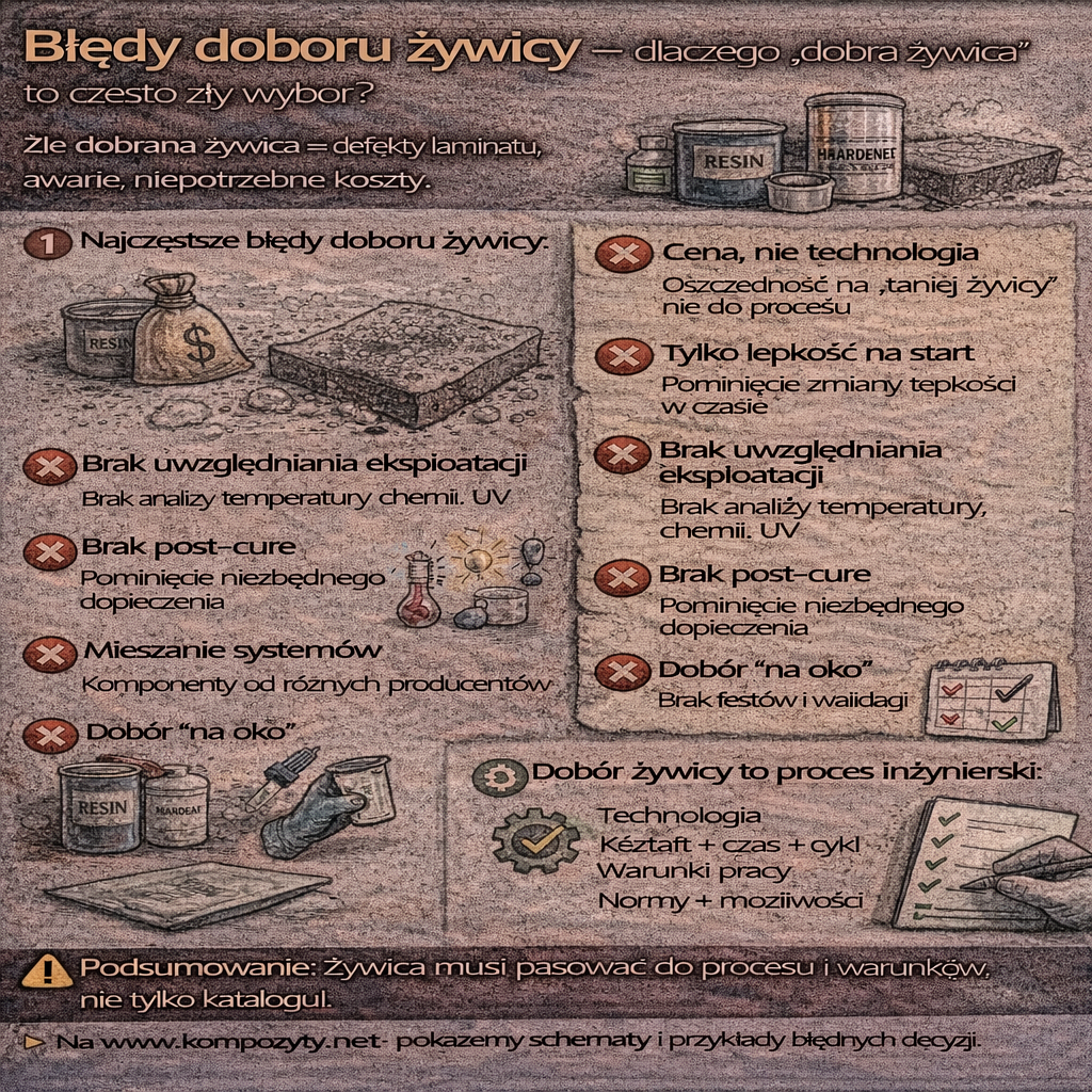 Dobór żywicy to jedna z najczęstszych przyczyn problemów jakościowych w kompozytach. Co istotne, rzadko chodzi o „złą żywicę” – najczęściej problemem jest niedopasowanie żywicy do technologii, warunków pracy lub realnych wymagań elementu. Skutkiem są defekty, przedwczesne awarie i niepotrzebnie wysokie koszty. Dlaczego dobór żywicy jest tak krytyczny? Żywica decyduje o: ➡️ Nawet idealne włókno i forma nie uratują […]