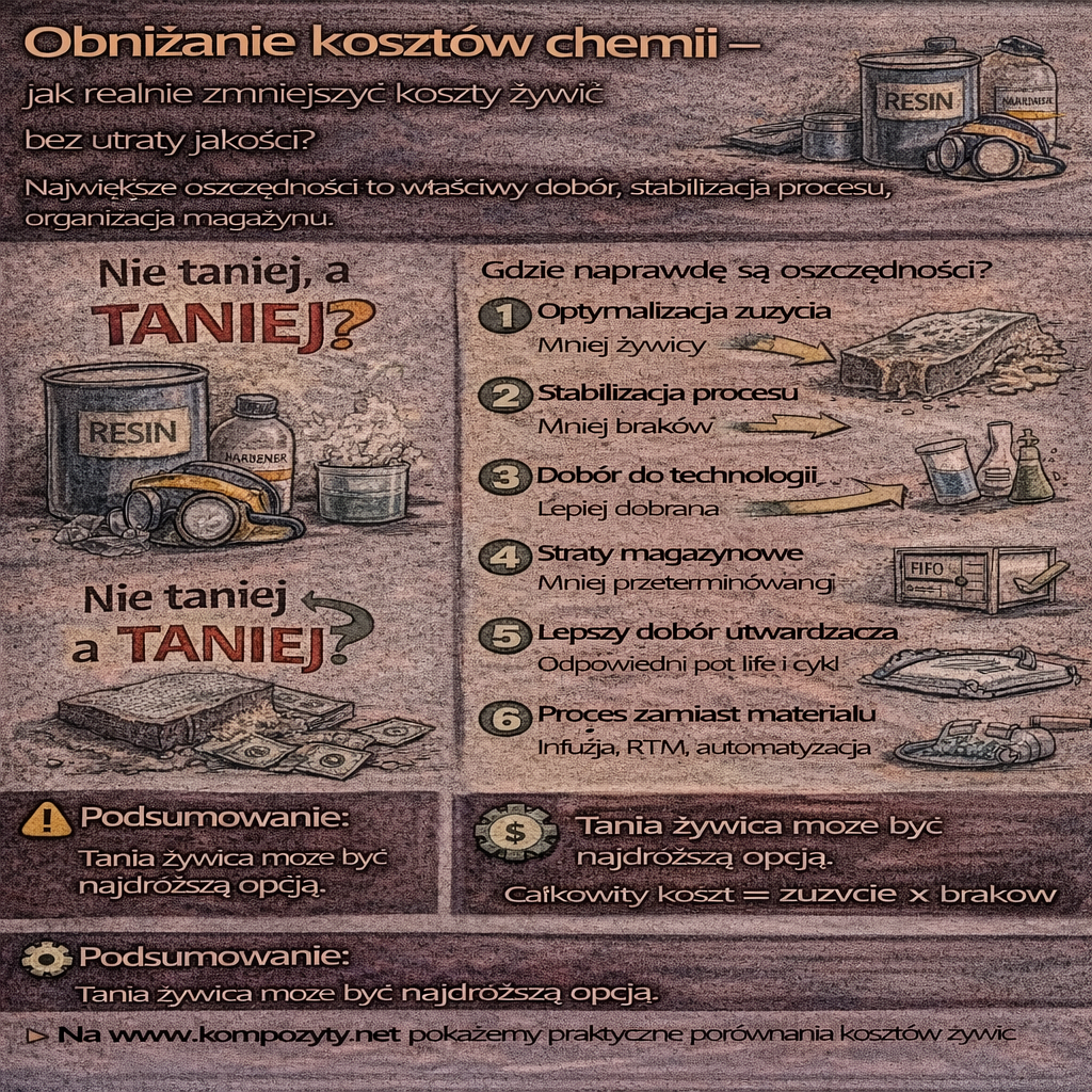 Koszty żywic stanowią istotną część kosztów produkcji kompozytów, ale wbrew pozorom rzadko są najlepszym miejscem do prostych oszczędności. Największe rezerwy kosztowe kryją się nie w cenie za kilogram, lecz w sposobie doboru, magazynowania i przetwarzania chemii. Źle zaplanowane „oszczędzanie” na żywicy niemal zawsze kończy się wzrostem braków i kosztów pośrednich. Dlaczego chemia wydaje się droga? Żywice postrzegane są […]