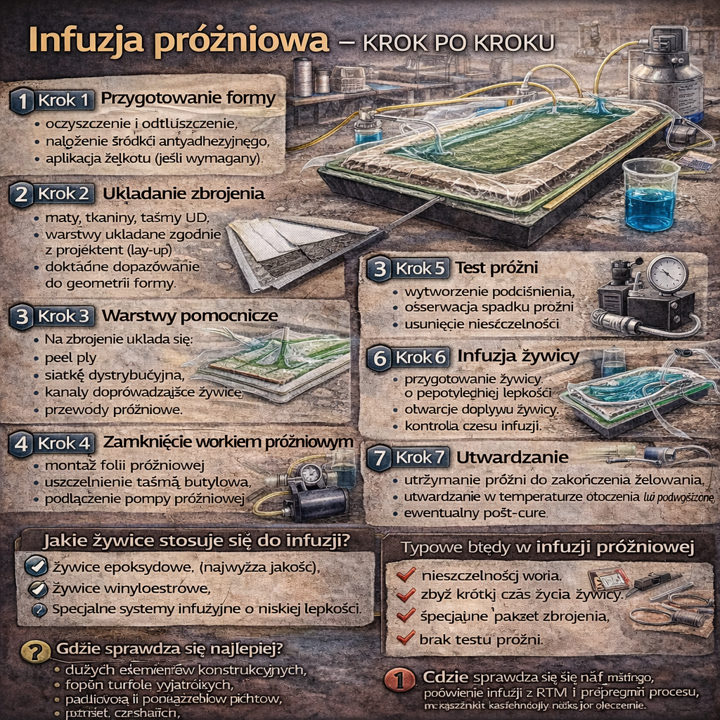 Infuzja próżniowa (vacuum infusion) to jedna z najczęściej stosowanych zamkniętych technologii wytwarzania laminatów kompozytowych. Pozwala uzyskać elementy o wysokiej jakości, niskiej porowatości i dobrej powtarzalności, przy jednoczesnym ograniczeniu emisji żywic i poprawie warunków pracy. Technologia ta jest dziś standardem m.in. w energetyce wiatrowej, przemyśle morskim i produkcji konstrukcji wielkogabarytowych. Na czym polega infuzja próżniowa? Infuzja […]