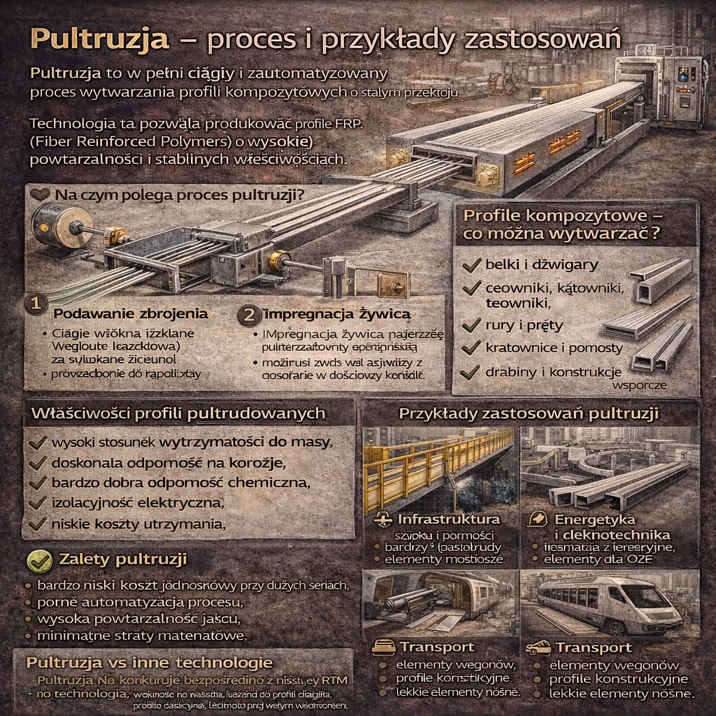 Pultruzja to w pełni ciągły i zautomatyzowany proces wytwarzania profili kompozytowych o stałym przekroju. Technologia ta jest jednym z najbardziej efektywnych kosztowo sposobów produkcji długich elementów FRP (Fiber Reinforced Polymers) o wysokiej powtarzalności i stabilnych właściwościach. Dzięki połączeniu niskiego kosztu jednostkowego, wysokiej trwałości i odporności środowiskowej, pultruzja jest dziś standardem w wielu sektorach przemysłu. Na […]