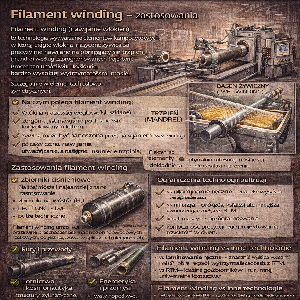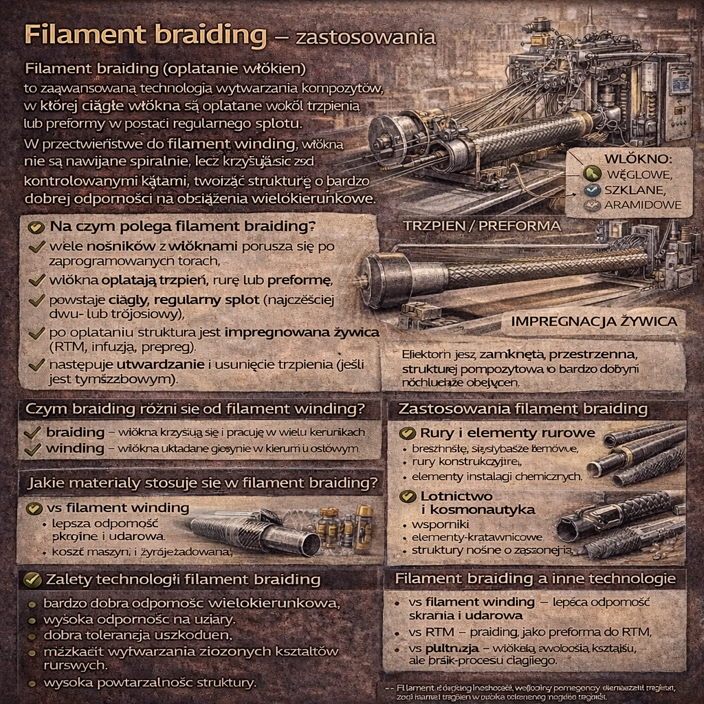 Filament braiding (oplatanie włókien) to zaawansowana technologia wytwarzania kompozytów, w której ciągłe włókna są oplatane wokół trzpienia lub preformy w postaci regularnego splotu. W przeciwieństwie do filament winding, włókna nie są nawijane spiralnie, lecz krzyżują się pod kontrolowanymi kątami, tworząc strukturę o bardzo dobrej odporności na obciążenia wielokierunkowe. Technologia ta znajduje zastosowanie wszędzie tam, gdzie […]