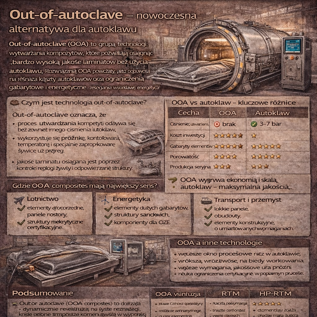 Out-of-autoclave (OOA) to grupa technologii wytwarzania kompozytów, które pozwalają osiągnąć bardzo wysoką jakość laminatów bez użycia autoklawu. Rozwiązania OOA powstały jako odpowiedź na rosnące koszty autoklawów oraz ograniczenia gabarytowe i energetyczne, szczególnie w lotnictwie, energetyce i przemyśle. Dziś OOA composites są uznawane za jedną z kluczowych dróg rozwoju technologii kompozytowych. Czym jest technologia out-of-autoclave? Out-of-autoclave […]