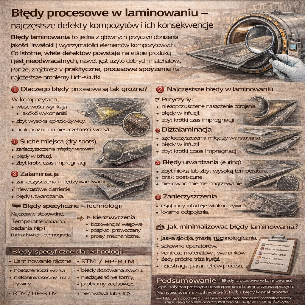 Błędy laminowania to jedna z głównych przyczyn obniżenia jakości, trwałości i wytrzymałości elementów kompozytowych. Co istotne, wiele defektów powstaje na etapie produkcji i jest nieodwracalnych, nawet jeśli użyto dobrych materiałów. Poniżej znajdziesz praktyczne, procesowe spojrzenie na najczęstsze problemy i ich skutki. 1) Dlaczego błędy procesowe są tak groźne? W kompozytach: Dlatego kontrola procesu jest równie […]