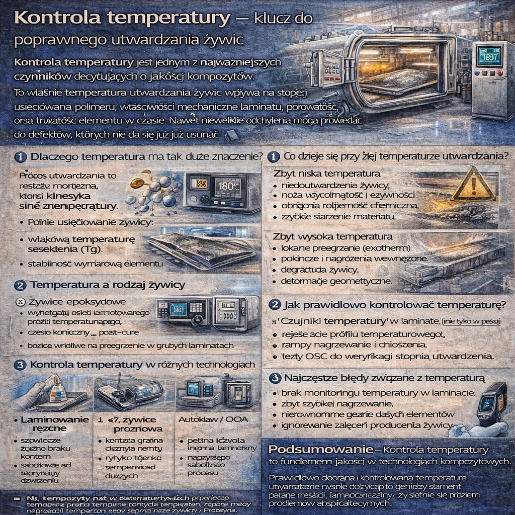 Kontrola temperatury jest jednym z najważniejszych czynników decydujących o jakości kompozytów. To właśnie temperatura utwardzania żywic wpływa na stopień usieciowania polimeru, właściwości mechaniczne laminatu, porowatość oraz trwałość elementu w czasie. Nawet niewielkie odchylenia mogą prowadzić do defektów, których nie da się już usunąć. Dlaczego temperatura ma tak duże znaczenie? Proces utwardzania to reakcja chemiczna, której […]
