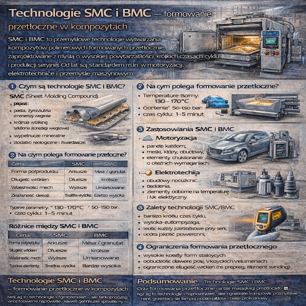 SMC i BMC to przemysłowe technologie wytwarzania kompozytów polimerowych formowanych przetłocznie, zaprojektowane z myślą o wysokiej powtarzalności, krótkich czasach cyklu i produkcji seryjnej. Od lat są standardem m.in. w motoryzacji, elektrotechnice i przemyśle maszynowym. Czym są technologie SMC i BMC? SMC (Sheet Molding Compound) SMC to półprodukt w postaci arkuszy: Arkusze SMC są dozowane do […]