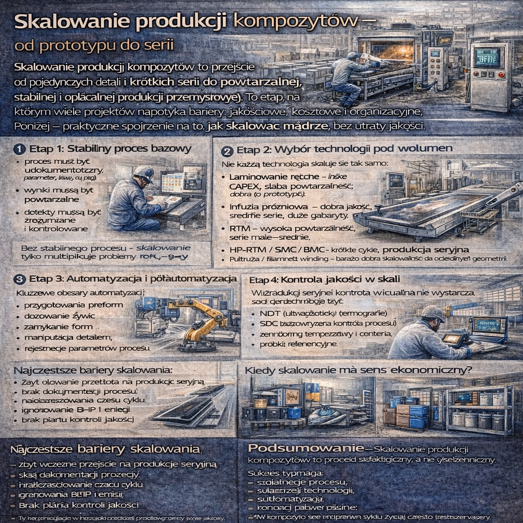 Skalowanie produkcji kompozytów to przejście od pojedynczych detali i krótkich serii do powtarzalnej, stabilnej i opłacalnej produkcji przemysłowej. To etap, na którym wiele projektów napotyka bariery: jakościowe, kosztowe i organizacyjne. Poniżej – praktyczne spojrzenie na to, jak skalować mądrze, bez utraty jakości. Czym jest skalowanie w kompozytach? Skalowanie oznacza: W kompozytach to szczególnie trudne, bo […]