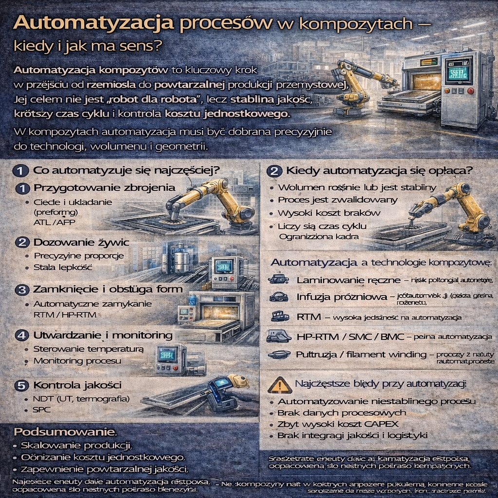 Automatyzacja kompozytów to kluczowy krok w przejściu od rzemiosła do powtarzalnej produkcji przemysłowej. Jej celem nie jest „robot dla robota”, lecz stabilna jakość, krótszy czas cyklu i kontrola kosztu jednostkowego. W kompozytach automatyzacja musi być dobrana precyzyjnie do technologii, wolumenu i geometrii. Czym jest automatyzacja w produkcji kompozytów? To zastępowanie (lub wspieranie) operacji manualnych urządzeniami […]