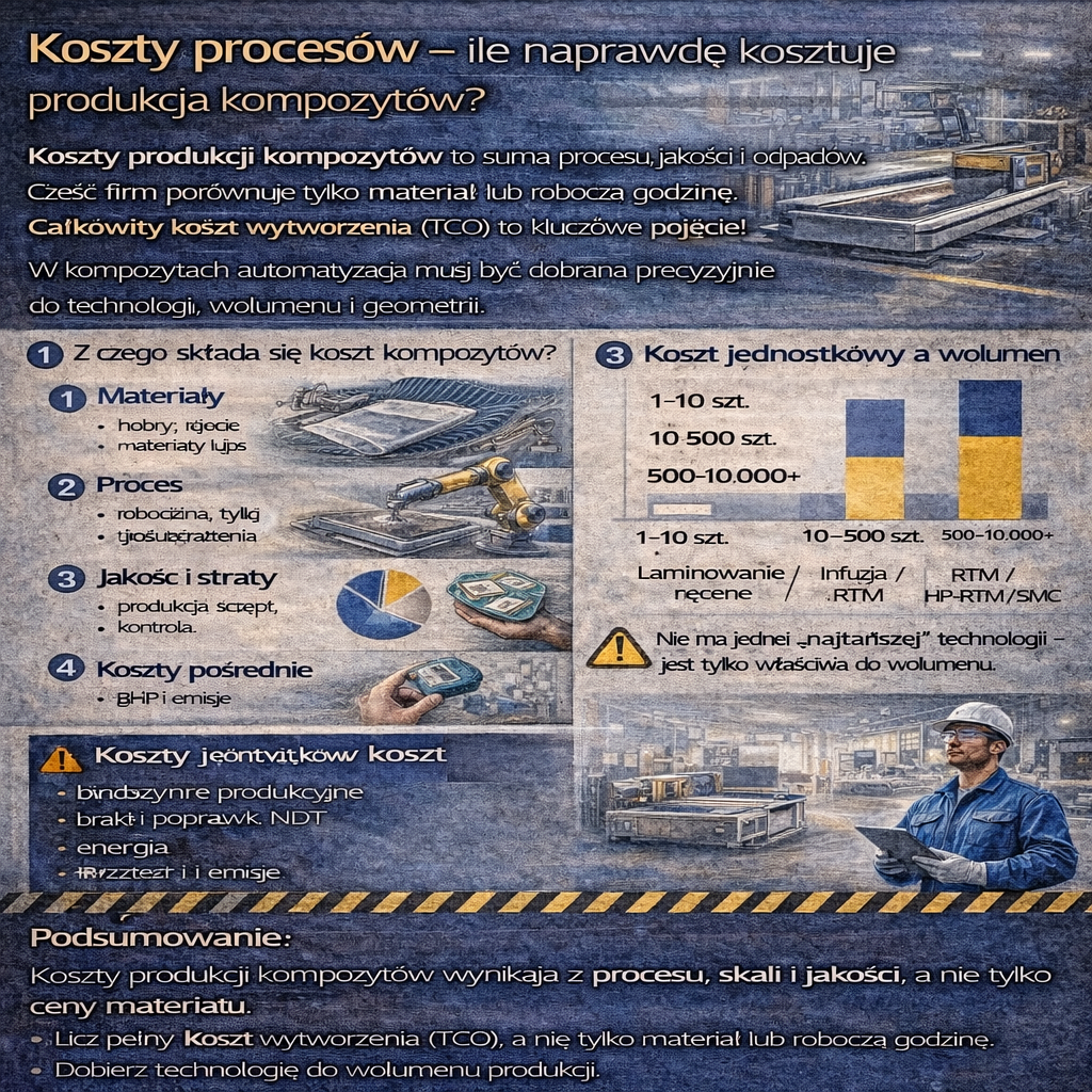 Koszty produkcji kompozytów są jednym z najczęściej źle rozumianych aspektów tej technologii. Często porównuje się wyłącznie cenę materiału, pomijając koszty procesu, jakości, odpadów i eksploatacji. W praktyce o opłacalności decyduje całkowity koszt wytworzenia (TCO/LCC), a nie tylko cena żywicy czy włókna. Poniżej – inżynierskie spojrzenie na koszty procesów kompozytowych. Z czego składa się koszt produkcji […]
