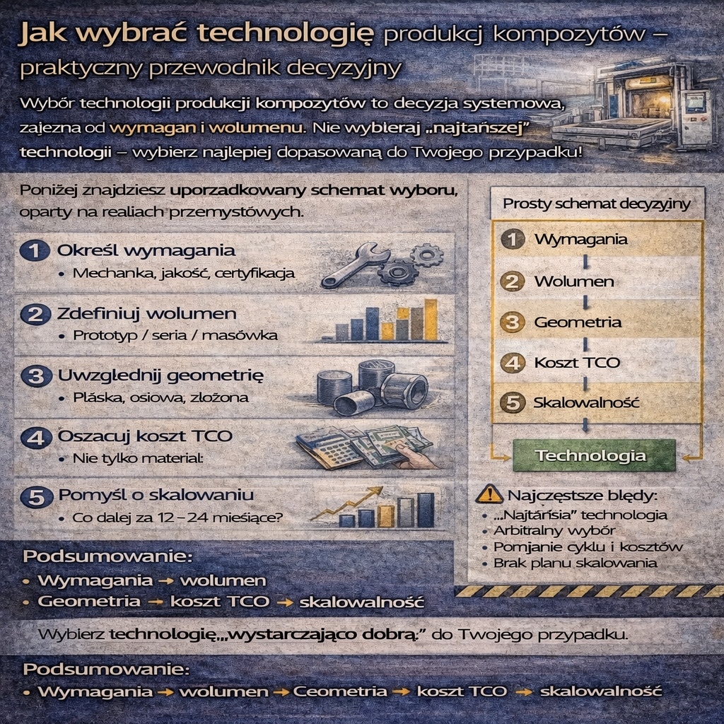 Wybór technologii produkcji kompozytów to jedna z najważniejszych decyzji projektowo-biznesowych. Od niej zależą koszt jednostkowy, jakość, skalowalność, ryzyko braków oraz możliwość certyfikacji. Nie istnieje jedna „najlepsza” technologia – istnieje najlepiej dopasowana do konkretnego przypadku. Poniżej znajdziesz uporządkowany schemat wyboru, oparty na realiach przemysłowych. Krok 1: Określ wymagania produktu Zanim spojrzysz na technologie, odpowiedz na kluczowe […]