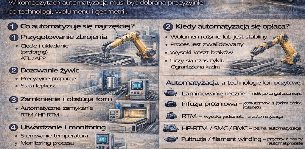➡️ Na kompozyty.net w kolejnych artykułach pokażemy konkretne przykłady automatyzacji: od infuzji półautomatycznej po linie HP-RTM i SMC/BMC – z liczbami, nie marketingiem.