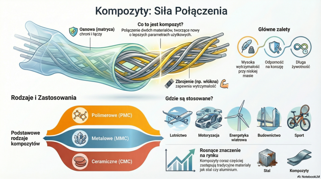 ➡️ To właśnie to połączenie sprawia, że materiały kompozytowe są tak szeroko stosowane w nowoczesnym przemyśle.
