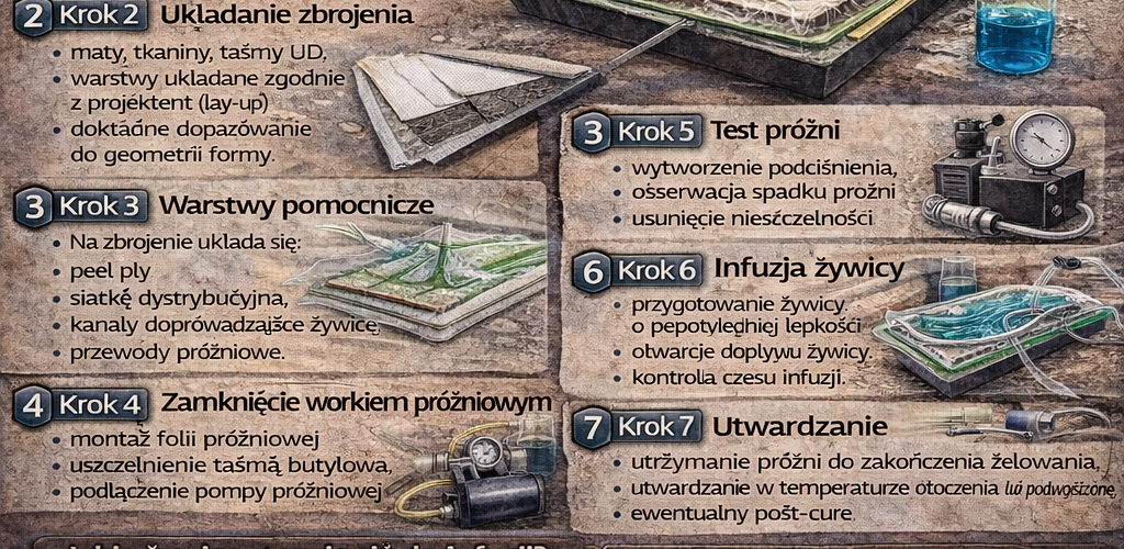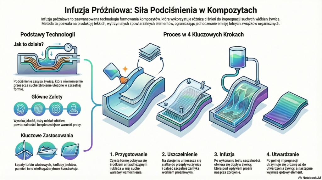 Żywica impregnuje włókna dopiero po zamknięciu układu, co daje znacznie lepszą kontrolę procesu niż w laminowaniu ręcznym.
