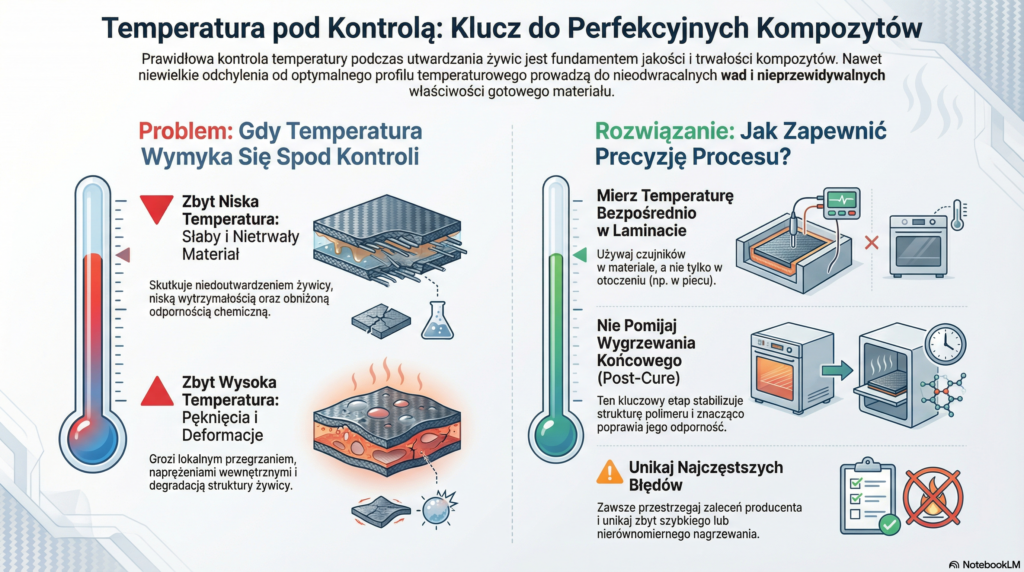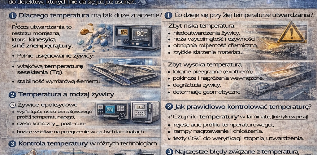 Kontrola temperatury jest jednym z najważniejszych czynników decydujących o jakości kompozytów. To właśnie temperatura utwardzania żywic wpływa na stopień usieciowania polimeru, właściwości mechaniczne laminatu, porowatość oraz trwałość elementu w czasie. Nawet niewielkie odchylenia mogą prowadzić do defektów, których nie da się już usunąć.