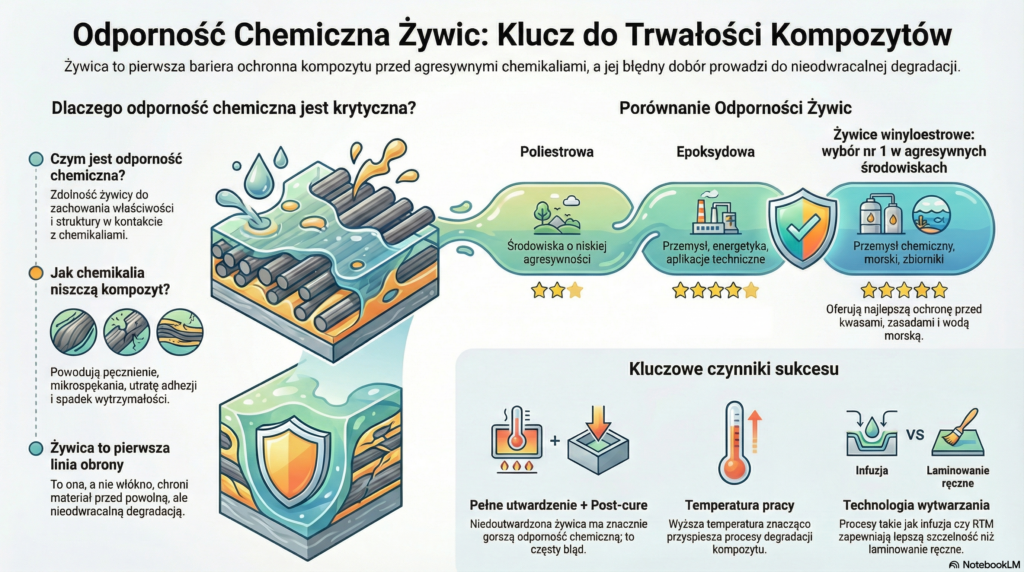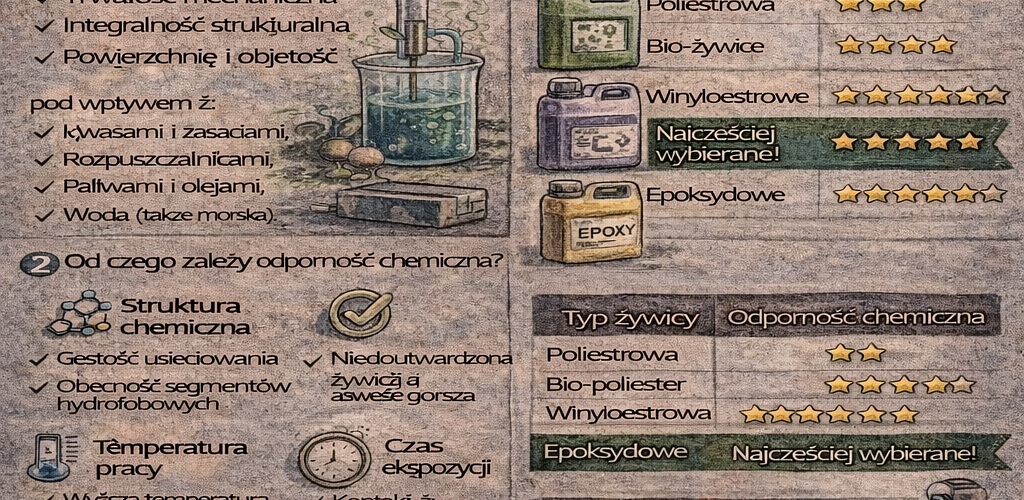 Odporność chemiczna żywic to parametr krytyczny dla trwałości kompozytów pracujących w trudnych warunkach.