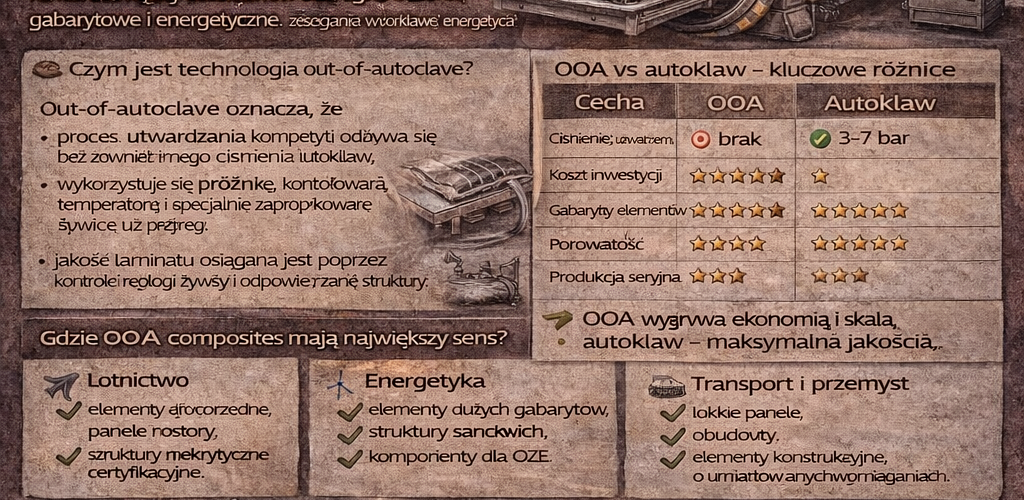 Out-of-autoclave (OOA composites) to dojrzała i dynamicznie rozwijająca się grupa technologii, która realnie zmniejsza barierę wejścia w wysokiej jakości kompozyty.