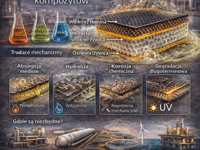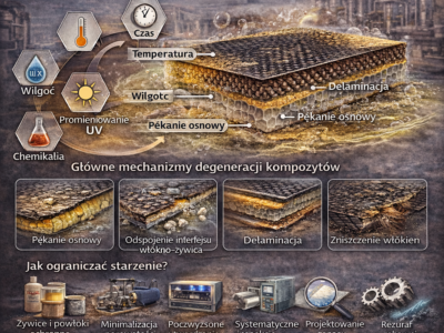 Starzenie materiałów kompozytowych to długotrwały proces zmian fizycznych, chemicznych i mechanicznych zachodzących w kompozycie pod wpływem czasu oraz środowiska eksploatacji. W praktyce...