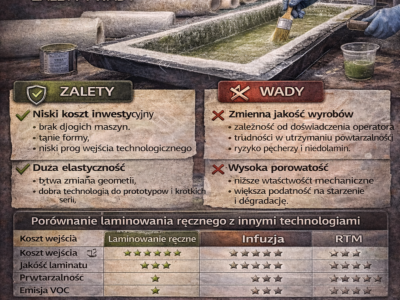 Laminowanie ręczne (hand lay-up) to jedna z najstarszych i najprostszych technologii wytwarzania kompozytów polimerowych. Mimo rozwoju nowoczesnych procesów (infuzja, RTM, prepregi), metoda...