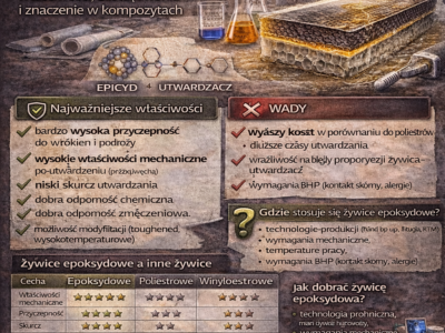 Żywice epoksydowe to jedna z najważniejszych grup żywic stosowanych w technologiach kompozytowych. Cenione są za bardzo dobre właściwości mechaniczne, wysoką przyczepność do...