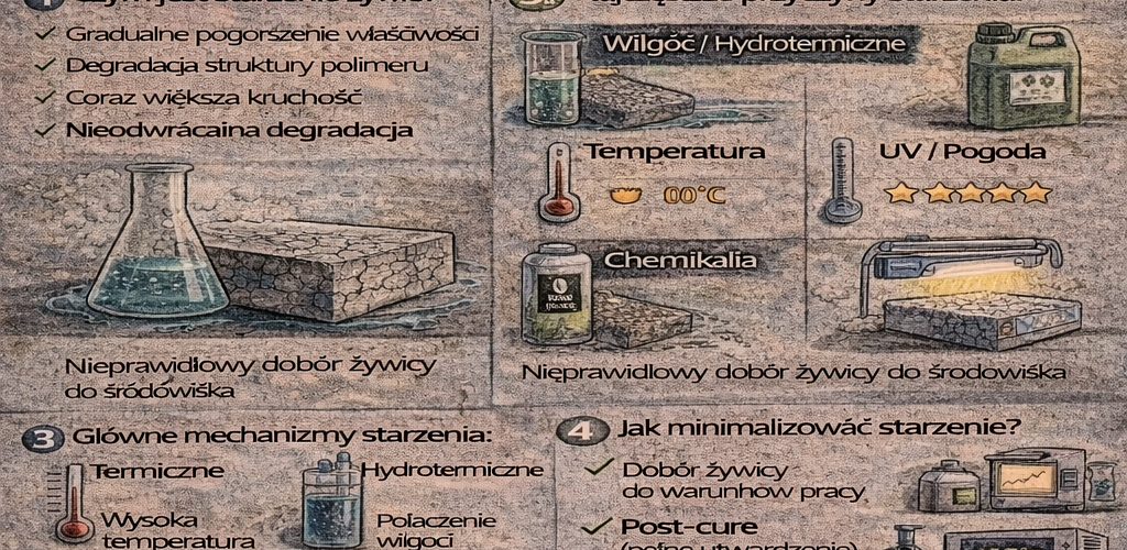 Starzenie żywic epoksydowych to proces stopniowej degradacji właściwości materiału, zachodzący pod wpływem czasu, temperatury, środowiska chemicznego, wilgoci i promieniowania UV. Nawet najlepiej zaprojektowany kompozyt może tracić swoje parametry, jeśli warunki eksploatacji nie zostały prawidłowo uwzględnione na etapie doboru żywicy i technologii.