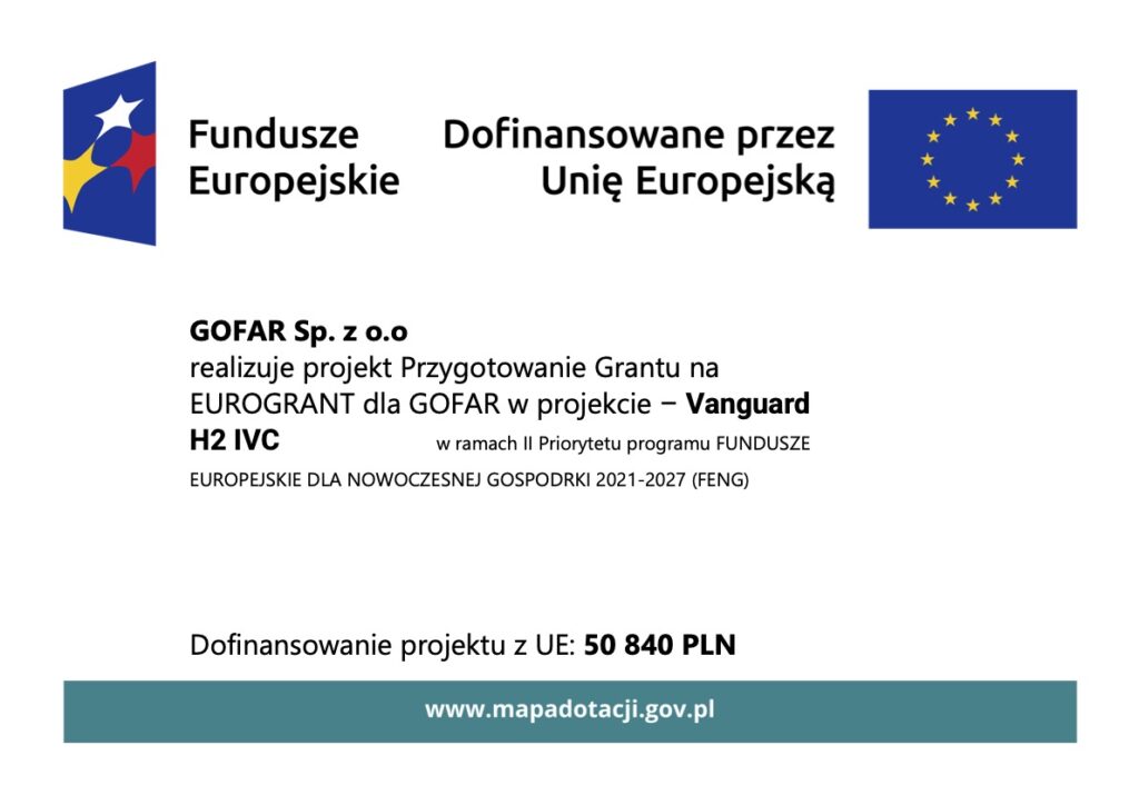 z przyjemnością informujemy, że realizujemy projekt pt. „Przygotowanie projektu o Eurogrant dla GOFAR- w projekcie – Vanguard H2 IVC ”, który otrzymał dofinansowanie w ramach II Priorytetu Programu Fundusze Europejskie dla Nowoczesnej Gospodarki 2021–2027 (FENG).