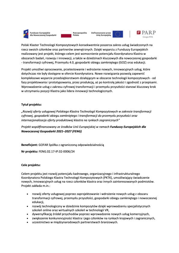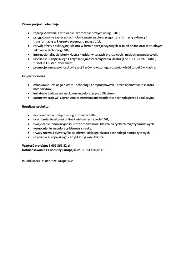 Tytuł projektu: „Stworzenie profesjonalnej platformy edukacyjno-konferencyjno-biznesowej dla branży technologii kompozytowych koincydencyjną z działaniami Polskiego Klastra Technologii Kompozytowych poprzez wdrożenie dedykowanego i autorskiego oprogramowania w celu zwiększenia przychodów spółki i uniezależnienia od sytuacji pandemicznej”