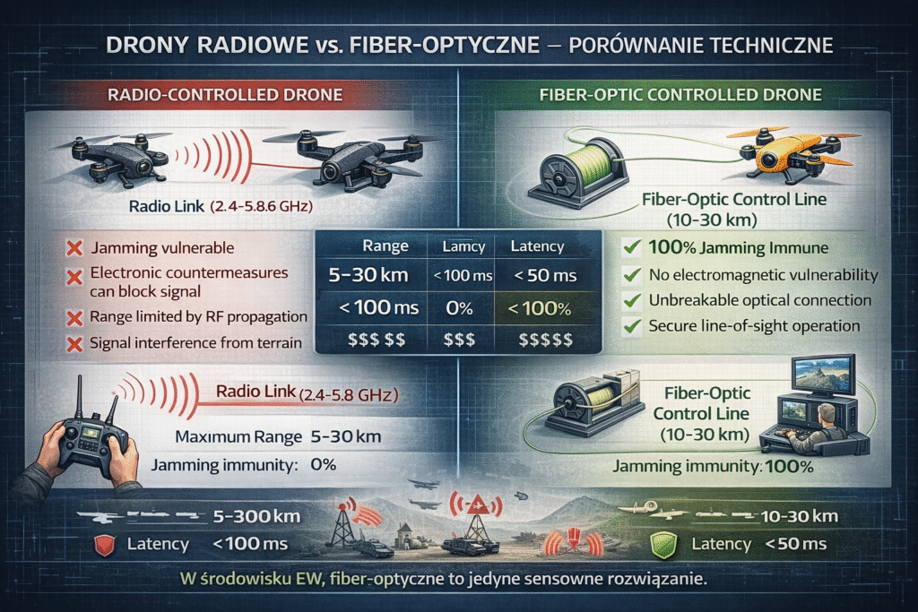 Technologia dronów światłowodowych nie jest wyłącznie odpowiedzią na doraźne potrzeby wojenne – to kierunek, który może zostać w ekosystemie UAV na dłużej, zwłaszcza tam, gdzie przeciwdziałanie zakłóceniom jest kluczowe. Zamiast określać ją jako „niepokonalną”, trafniej powiedzieć, że w porównaniu z łącznością radiową potrafi być wyraźnie bardziej odporna na zakłócanie, a jednocześnie wprowadza nowe wyzwania mechaniczne i materiałowe.