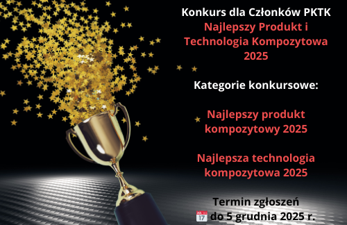 Zapraszamy Członków Polskiego Klastra Technologii Kompozytowych (PKTK) do udziału w konkursie, którego celem jest promocja najbardziej innowacyjnych rozwiązań z branży kompozytów wdrożonych lub rozwijanych w 2025 roku.