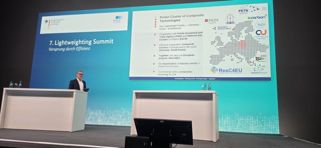 Podczas wydarzenia PKTK reprezentował dr Andrzej Czulak oraz Prof. Dariusz Perkowski. Dr Andrzej Czulak, prezes Polskiego Klastra Technologii Kompozytowych, który wystąpił z prezentacją pokazującą rosnącą rolę Polski w europejskim ekosystemie materiałów kompozytowych i technologii lightweight. W swoim wystąpieniu podkreślił, że kompozyty przestały być materiałem niszowym i stały się strategicznym zasobem dla przemysłu, transportu, energetyki i obronności. Zwrócił uwagę, że w warunkach niestabilności geopolitycznej, presji kosztowej oraz konieczności zwiększania efektywności, lekkie i wytrzymałe materiały znajdują się dziś w centrum przemysłowych i politycznych strategii rozwoju.